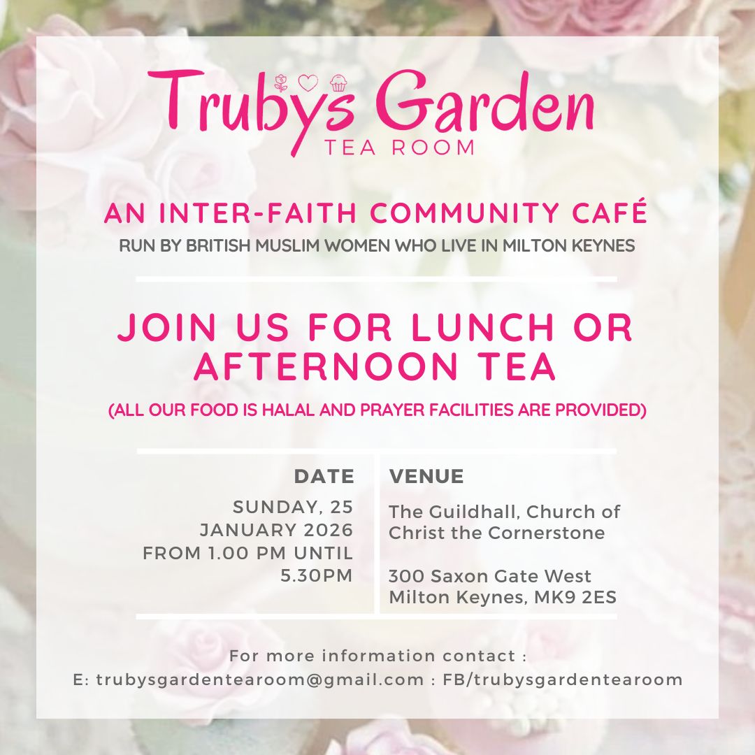 Trubys Garden Tea Room is an interfaith community cafe run by Muslim women building positive relationships between communities in Milton Keynes. Find out more about them here. Everyone is welcome. |